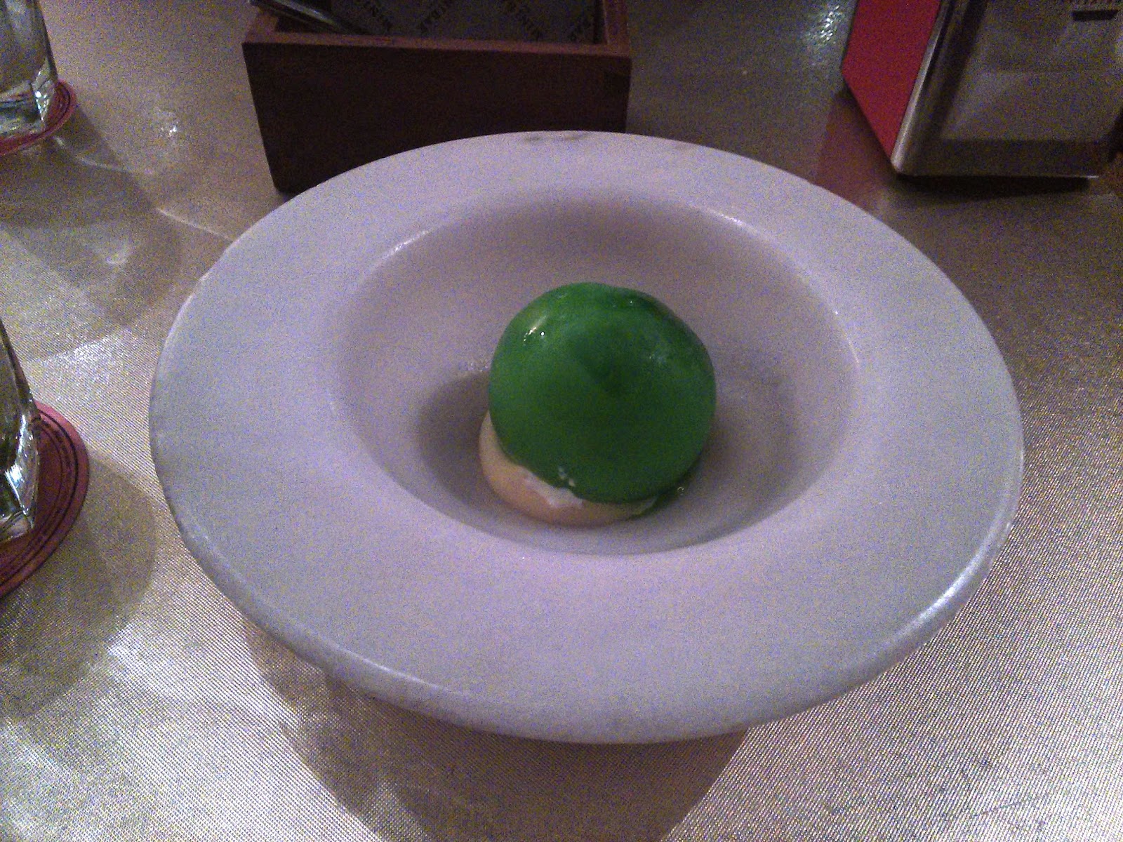 Depois as Azeitonas El Bulli 2005 versão XL-LX. Não sou muito fã de azeitonas mas estranhamente até gostei do sabor. O namorado adora azeitonas e gostou muito. Quando trincamos a "azeitona" há uma explosão de sabor, é sem dúvida um prato muito bem conseguido.